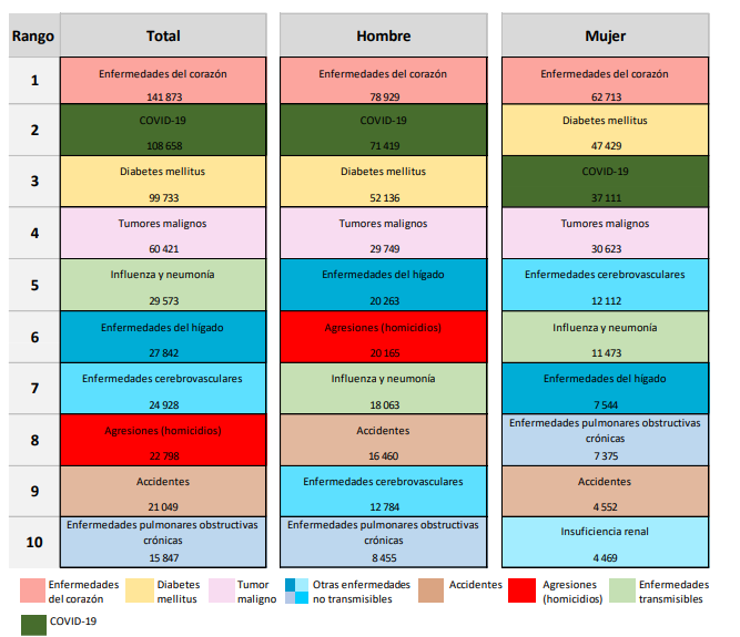 El Instituto detalló que la Covid-19 se convirtió durante dicho lapso en la segunda causa de muerte en el país. La cifra es 44.8% superior a la cifra de muertes asociadas con Covid-19, la nueva enfermedad de coronavirus que provocó la pandemia.