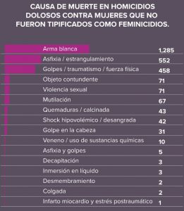 Las cifras revelaron cómo las autoridades dejaron fuera del conteo de feminicidios a 2 mil 646 mujeres que fueron asesinadas bajo contextos de extrema violencia y que encuadran en el tipo penal de feminicidio – como que existiera mutilación o violencia sexual- , por lo que debieron haber sido investigados así, y los acusados juzgados por feminicidio.