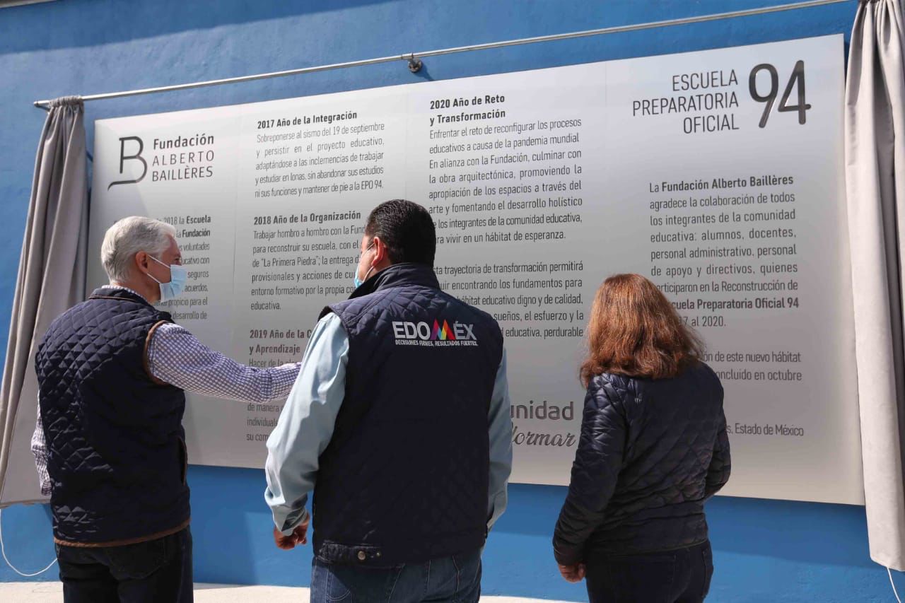 El Gobernador del Estado de México, Alfredo del Mazo entregó la reconstrucción de la Preparatoria Oficial Núm. 94, de Ecatepec, la cual sufrió daños estructurales durante el sismo del 19 de septiembre de 2017, y reconoció la colaboración de la Fundación Alberto Baillères, que estuvo a cargo de la restauración del plantel, que podrá ampliar su matrícula escolar hasta en mil 200 estudiantes y, con base en un nuevo modelo, promueve la colaboración y la unidad de la comunidad escolar.